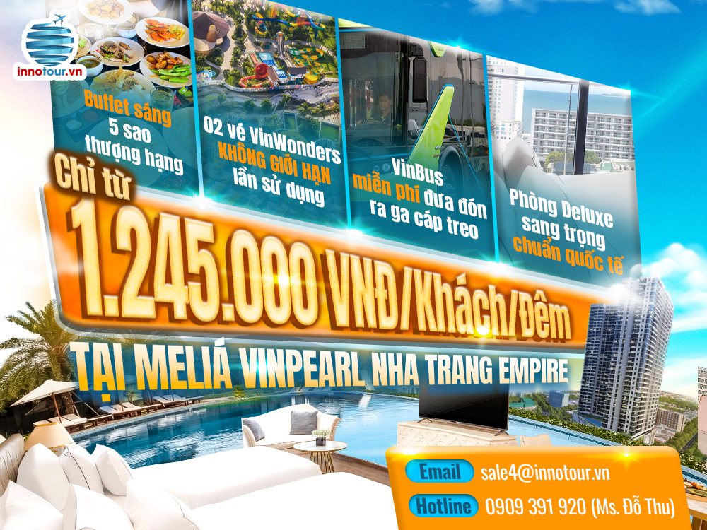 Bạn đang tìm kiếm một kỳ nghỉ thượng lưu nhưng vẫn tối ưu ngân sách? Chỉ từ 1.245.000 VNĐ/khách/đêm, cơ hội tận hưởng dịch vụ đẳng cấp thế giới tại Meliá Vinpearl Nha Trang Empire đã nằm trong tầm tay. Đây không phải là phân khúc giá rẻ, mà là đặc quyền kinh tế chỉ dành riêng cho khách hàng của đối tác chiến lược InnoTour. Tại sao đây là Deal "hời" nhất năm 2026 dành cho bạn?