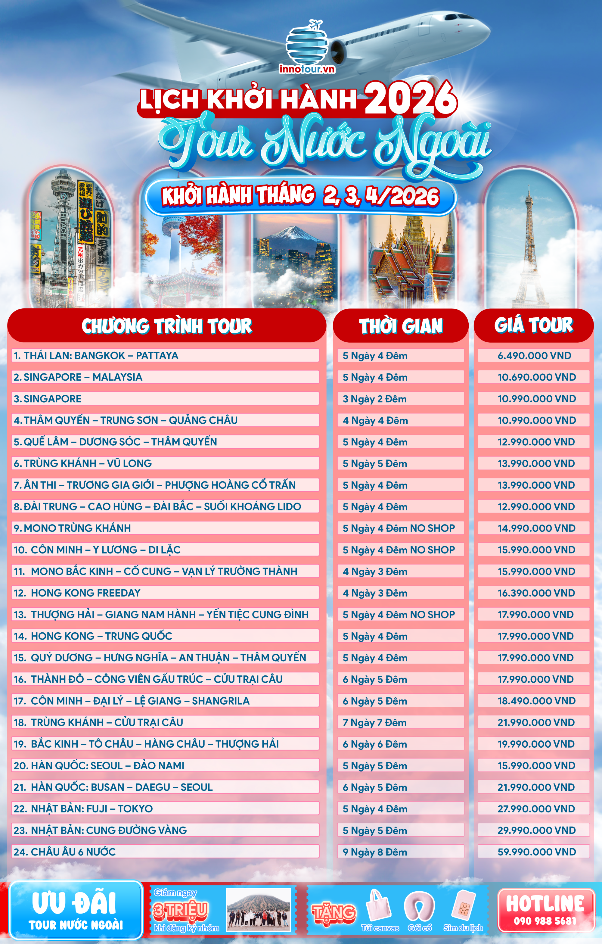 Lịch khởi hành chùm tour nước ngoài 2026 tại INNOTOUR