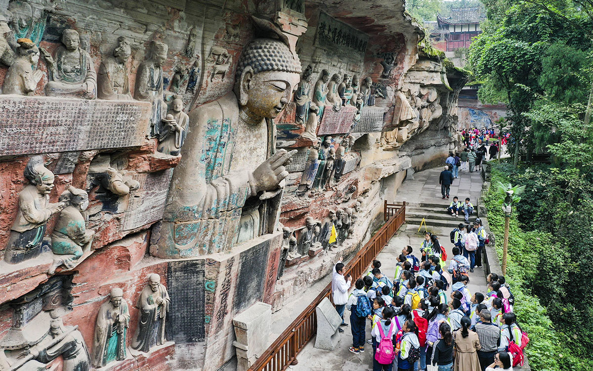 Đoàn di chuyển (1.5–2 giờ xe) đến tham quan Đại Túc Thạch Khắc – di sản văn hóa thế giới, kiệt tác nghệ thuật điêu khắc đá từ cuối đời Đường – đầu Tống. Nơi đây được UNESCO công nhận là Di sản Văn hóa Thế giới năm 1999 và được xem là một kiệt tác tổng hợp của nghệ thuật hang động đá Trung Quốc