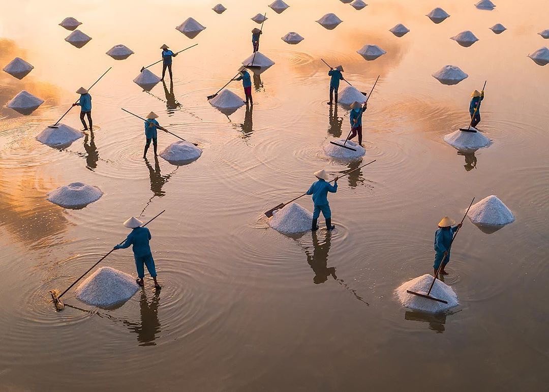 - Đoàn khởi hành tiếp tục hành trình. Quý khách thưởng ngoạn Cánh Đồng Muối. Nhờ điều kiện tự nhiên, khí hậu hanh nóng nhiều gió vô cùng thuận lợi. Vùng đất Ninh Thuận trở thành vựa muối lớn nhất nhì cả nước. Muối Ninh Thuận được xem là chất lượng hàng đầu nước ta. Quý khách được ngắm nhìn những ruộng muối trải dài đến hàng chục héc ta, vẻ đẹp lao động của người diêm dân, bên những ụ muối, những ô ruộng đẫm nước. Những diêm dân cần mẫn cào muối, gánh muối rồi chất thành từng ụ muối trắng xóa.